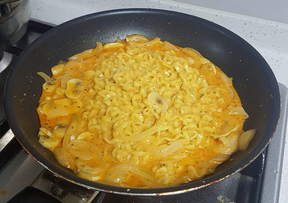 양파와 버섯을 채 썰어 준다. 양파는 껍질을 까고 물로 한번 씻어줘야 하지만 버섯은 물로 씻으면 좋지 않다고 해서 키친타월로 가볍게 닦아줬다. 마찬가지로 비엔나소시지도 잘라주는데 요즘 비엔나소시지가 예전과 달리 톡톡 터지는 느낌이 드는 것들이 많은데 고를 때 이미지 사진에 살코기처럼 비게 부분이 있거나 성분표에 돼지고기의 함량을 보는 것도 좋다. 팬에 기름이나 버터를 넣어 양파부터 버섯, 소시지 순으로 볶아주고 면을 익힐 물을 끓여준다. 일반 스파게티 면이라면 재료를 썰기 전에 끓여줘야 하지만 까르보 불닭에 있는 면을 그대로 사용해줄 때는 만드는 중간에 면을 끓여준다. 어느 정도 재료가 익으면 우유나 크림을 넣어준다. 우유나 크림의 양은 자신이 좋아하는 소스의 묽기에 따라 더 넣거나 줄여도 좋다. 반 정도 익은 면을 건져 소스에 넣고 약불로 줄여 소스와 섞이도록 한다. 이때 불닭소스를 넣고 같이 들어있는 분말스프를 넣어주면 소스가 어느 정도 점성이 생긴다.
